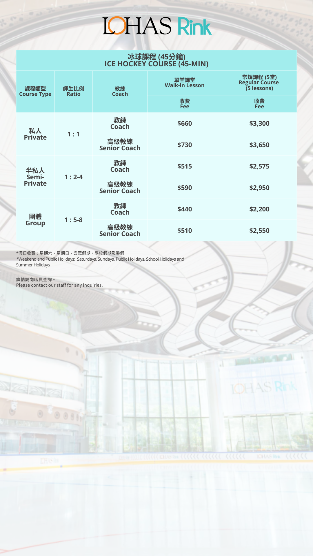 LOHAS Rink provides a newly equipped, safe learning environment for players to participate in all types of ice hockey training and competitive games.